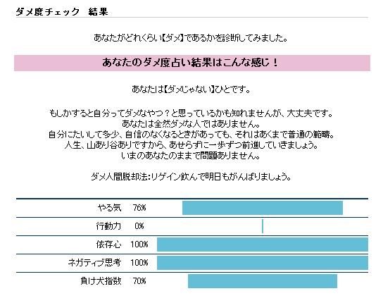 行動力0%とネガティブ思考100%ってその時点で絶望的だと思うんですが(;´Д`) 他にもいろいろなやつがあったので気になった人はやってもらえたらな~と思いますね。