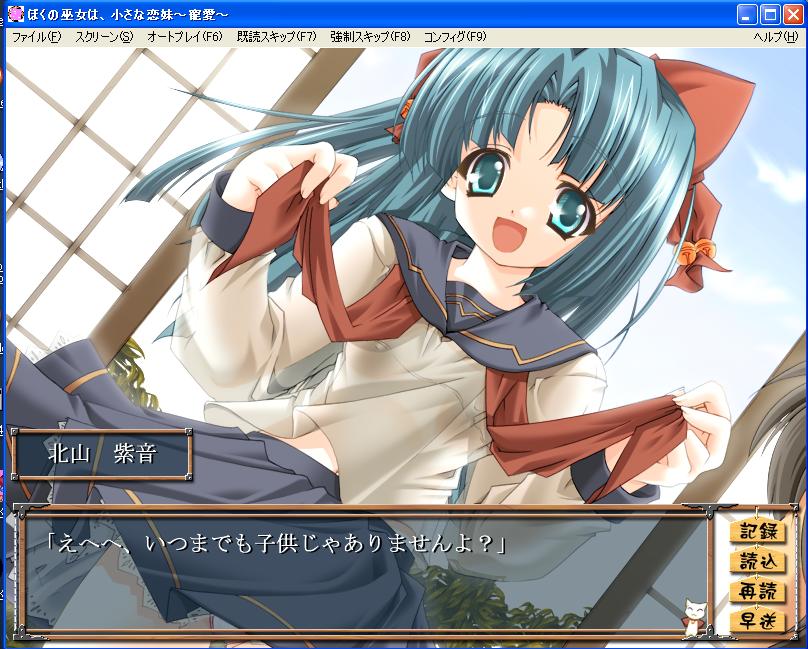 へなへな氏に教えてもらったメッセに挑戦してみました。 正直むずいです。 全く持ってわからないです。 「世界の中心で愛を叫ぶ」レベルに助けてほしいです。 誰かこの私にメッセの知識を(;´Д`) まぁよく分かりませんが勝手にリンクを張っている方々のメッセのところに適当にメッセージを送ってますよ(ぉ 送られた方は送ったやつはかなり痛い子だとお思いになってるでしょうがナチュラルスルーでもしてください。お暇であればどうぞ返信でもよろしくおねがいします。あとご指導よろしくしてほしいです。 まぁメッセの話はこれぐらいにして「僕の巫女は小さな恋妹~寵愛~」の一周目クリアヽ(´ー`)ノ 正直いって抜きゲーでしたよ(ぉ 前半パートをクリアしたら後半パートに入るのですがその後半が完全に抜きゲーとなってましたね。 修行に行く紫音→たまに会う→Hするの繰り返しでしたからね。まぁボリュームはかなりありましたね。 また立ち絵は見るのがつらいぐらいでしたが、イベントCGはなかなかと妙な作りになっていましたね。まぁレビューは完全にクリアしてからにしますがこんな感じです。 「魔法が世界を救います」はかなり挫折気味です。フローラルートについに4周目突入しましたからね(;´Д`) 他の人のルートに入ってもストーリー展開は同じでしたからもうこれ以上はめんどくさいです(´д⊂ 最後に先日張った紫音の中学生バージョンを。